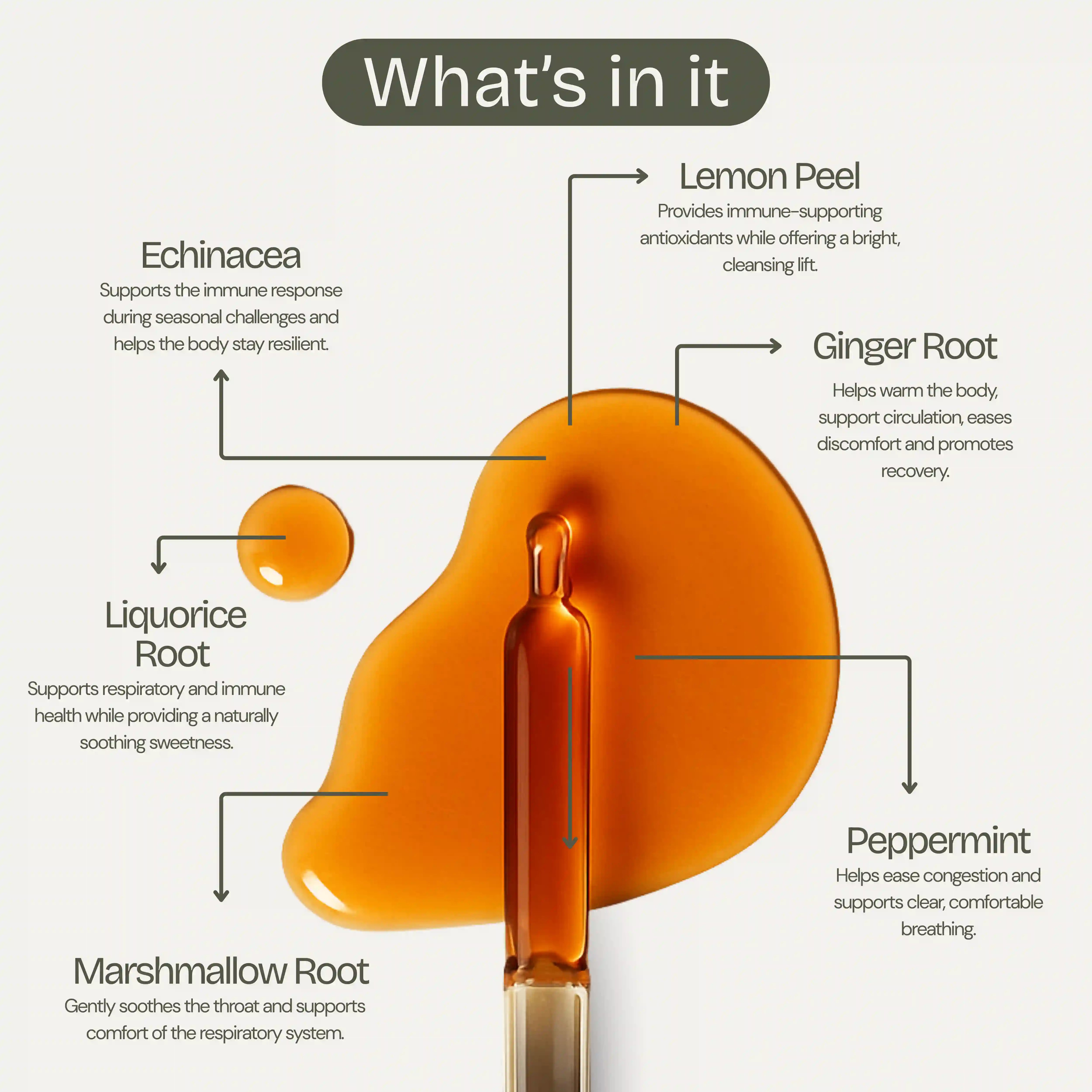 • Ginger Root: Warming and invigorating, helps soothe the body, ease discomfort, and promote recovery.